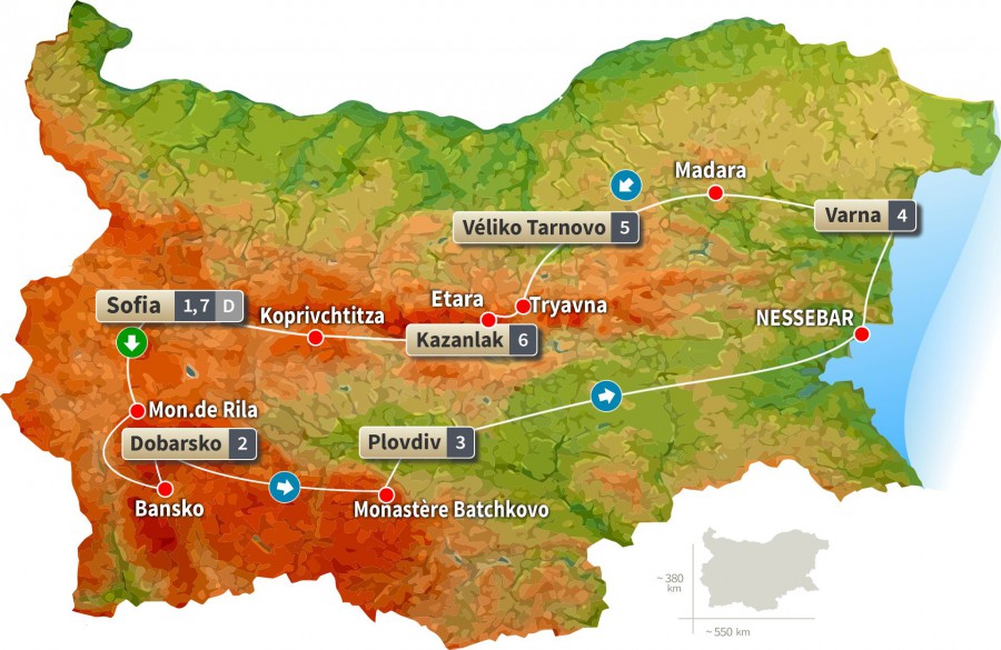 La route vous mènera jusqu'à la pittoresque presqu'île de Nessebar, sur la côte de la mer Noire.Cité antique inscrite au patrimoine mondial de l'humanité, Nessebar préserve un certain nombre de magnifiques églises byzantines de l'époque néo-chrétienne. Ne manquez pas l'église Saint Stefan, conservant des fresques exceptionnelles du 14e s. Dans l'après-midi vous continuez vers Varna - la capitale maritime de la Bulgarie. Une belle architecture, un grand jardin maritime et de nombreux points de visite intéressants (l'or travaillé le plus ancien au monde, musée de la marine, une exposition sur le quotidien pendant la période communiste...).
