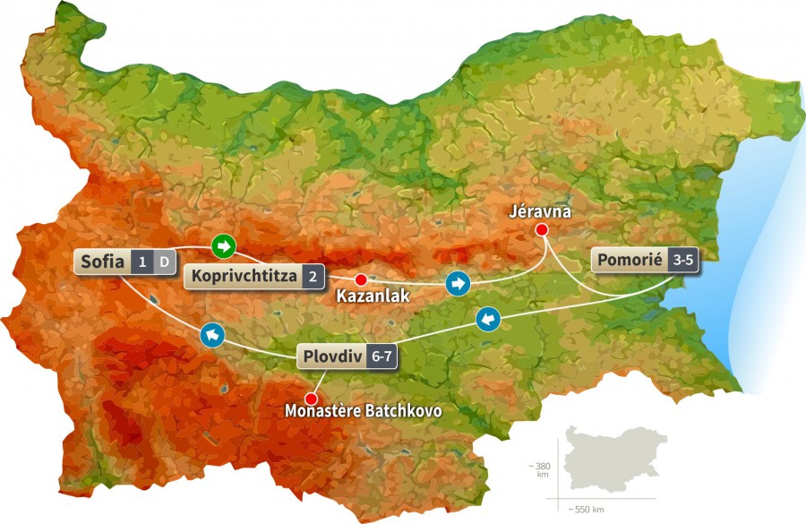 Aujourd'hui vous continuez votre chemin vers l'est, sous l'ombre du Balkan. Avant midi vous pouvez faire une immersion dans la culture thrace à travers deux de ses plus remarquables sites en Bulgarie. A Kazanlak, visitez la tombe thrace datée du 4e siècle avant notre ère et inscrite à l'Unesco en raison de ses somptueuses fresques. Près du village de Karanovo se situe un site thrace unique dans son genre : un authentique tumulus funéraire où sont exposés, comme ils furent trouvés, un char et ses chevaux ainsi que le chien qui les suit. De précieux et uniques objets thraces sont aussi exposés. Kazablak et Karavnovo sont proches l'un de l'autre. A midi vous arriverez à Jéravna, l'un des plus beaux villages bulgares. Son architecture tranche résolument avec ses proches voisins du l'autre côté du Balkan – des maisons centenaires en bois brut, élégamment travaillé, forment un ensemble harmonieux au milieu de paysages bucoliques. Sans oublier quelques très bons restaurants à la cuisine traditionnelle. En fin d'après-midi vous irez vers le littoral de la mer Noire (une heure et demi à deux heures).